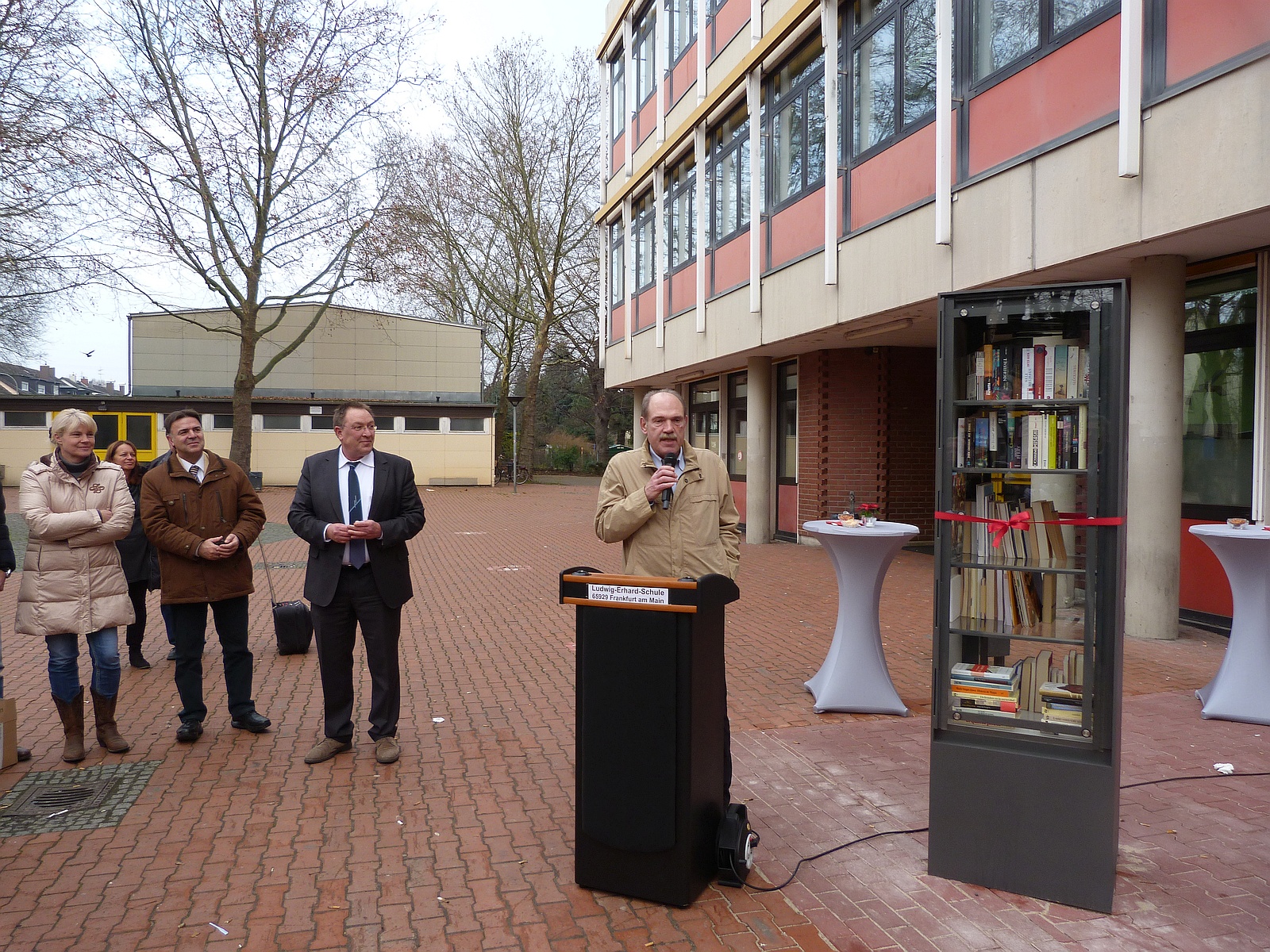 Unterliederbach hat seinen öffentlichen Bücherschrank. Nele Neuhaus, Autorin vieler bekannter Taunus-Krimis, hat ihn am 15. Dezember 2015 um 13 Uhr auf dem Gelände der Ludwig-Erhard-Schule in Frankfurt am Main Unterliederbach seiner Bestimmung übergeben. Im Beisein von Schulleiter Bernhard Friedrich, Mitgliedern des Lehrkörpers, Schülern und Schülerinnen und Mitgliedern des Ortsbeirats 6 durchschnitt die Erfolgsautorin das rote Band, mit dem der Bücherschrank bis dahin noch verschlossen war.