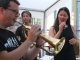 Bei dieser Aufnahme könnte man an die Beatles Revival Band denken, Claus Fischer an der Gitarre und Gilbert Foede am Schlagzeug. Wenn ich jetzt noch verrate, dass auch Oliver Bick auf der Schlossfest-Bühne stand. Am 12. Juli 2015 spielten aber Nuwanda mit Sängerin Inka im veregneten Brüningpark. Und Inka – nicht im Bild – trug natürlich eine rote Blume im Haar.