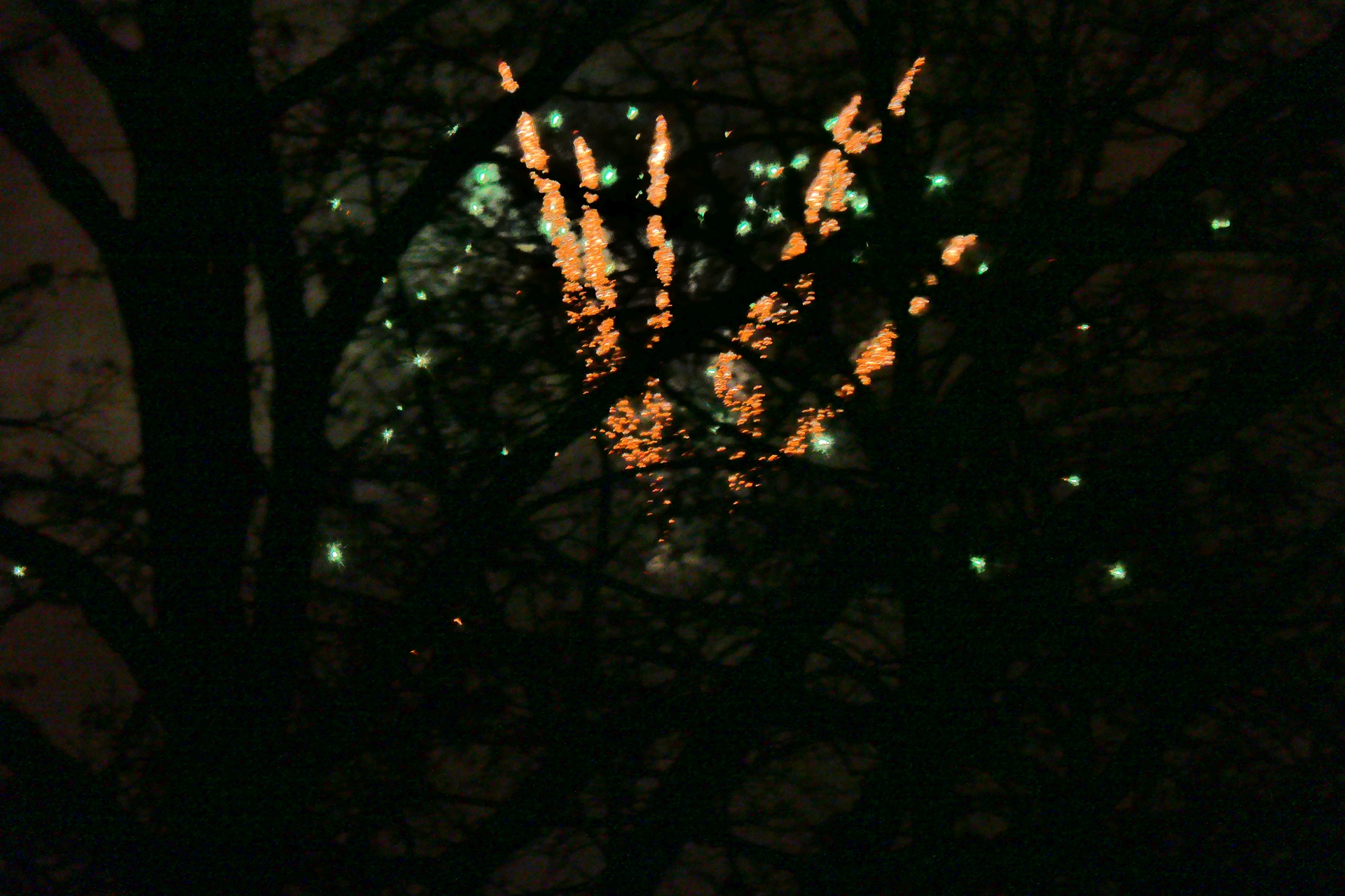 Der beschränkte Blick aus dem Fenster – noch durch eine Baumkrone gefiltert – zeigte einige Lichtblicke am nächtlichen Himmel. Bald aber verstummten die Kracher und wenigen Heuler und es trat wieder Ruhe und Dunkelheit ein.