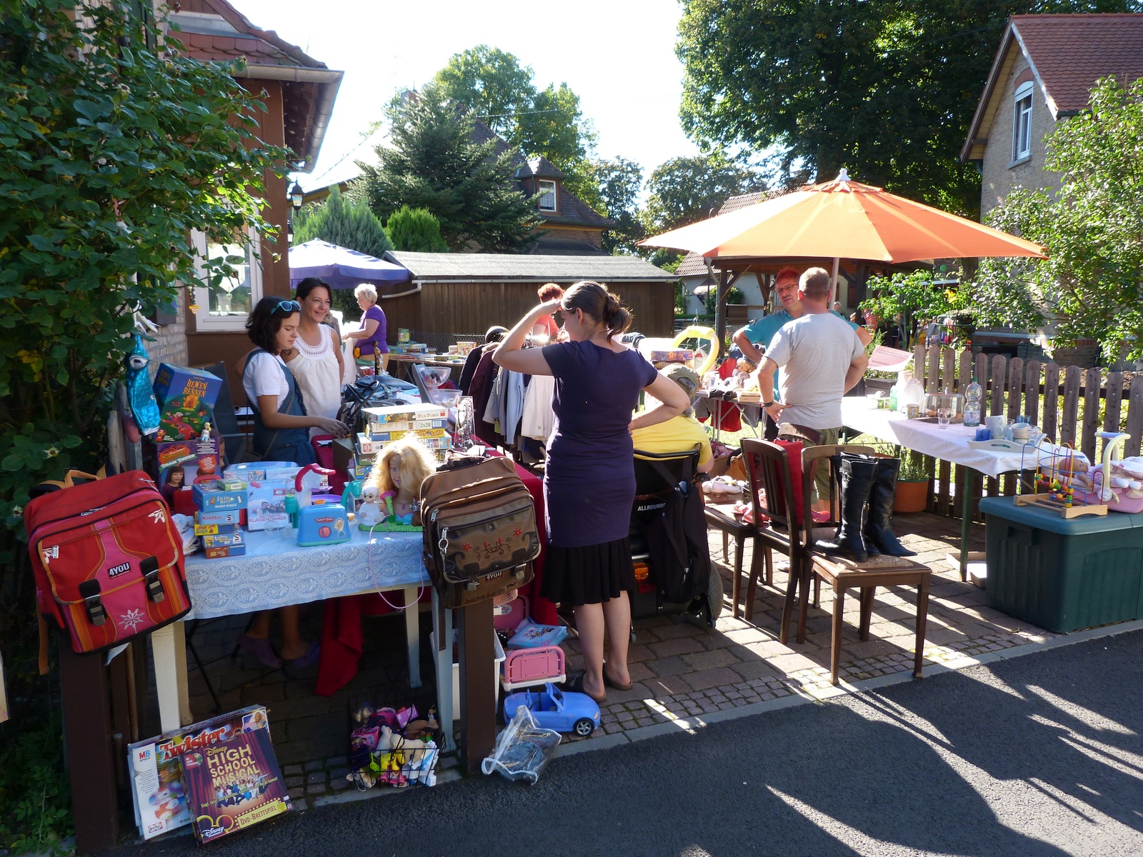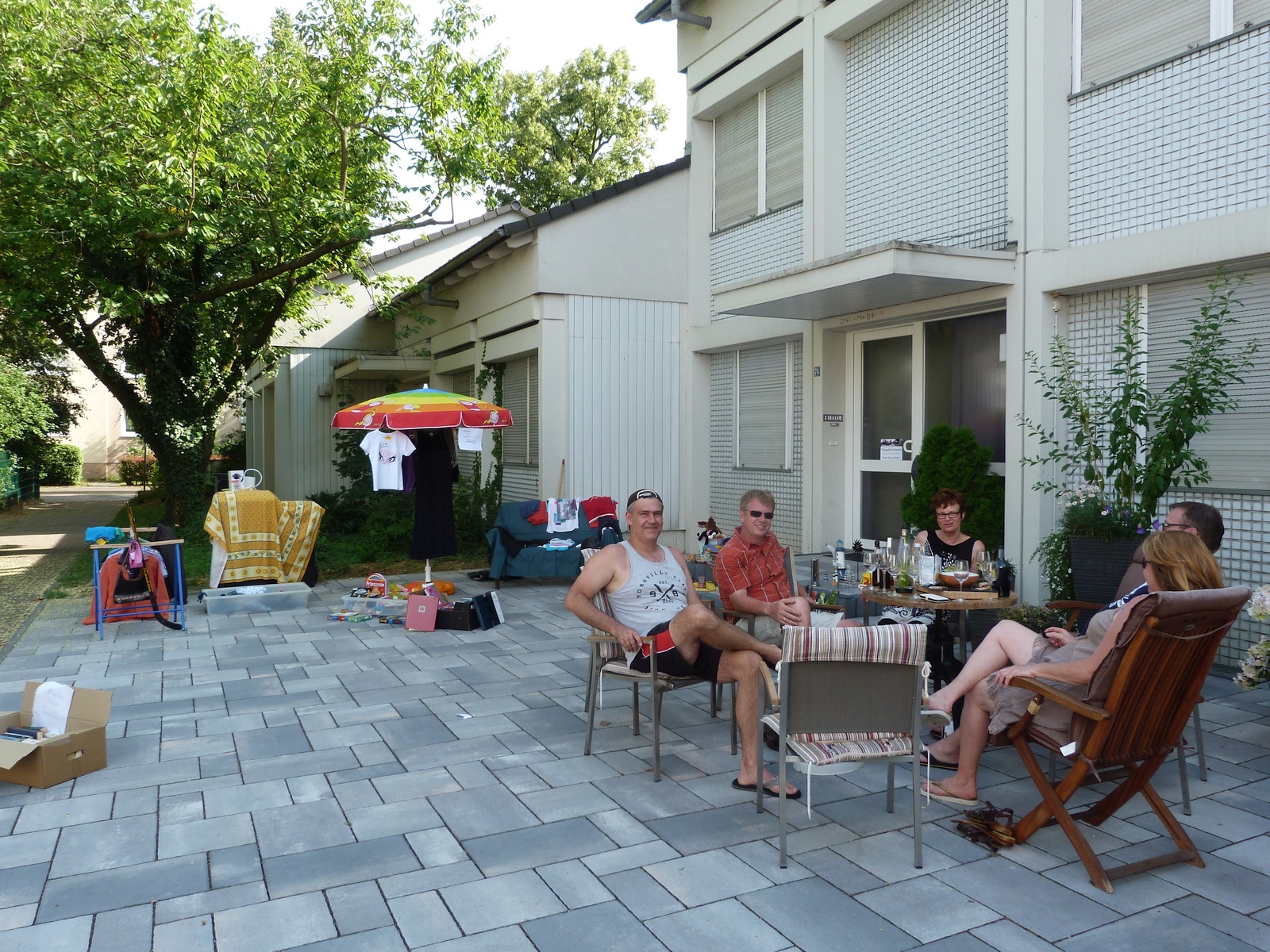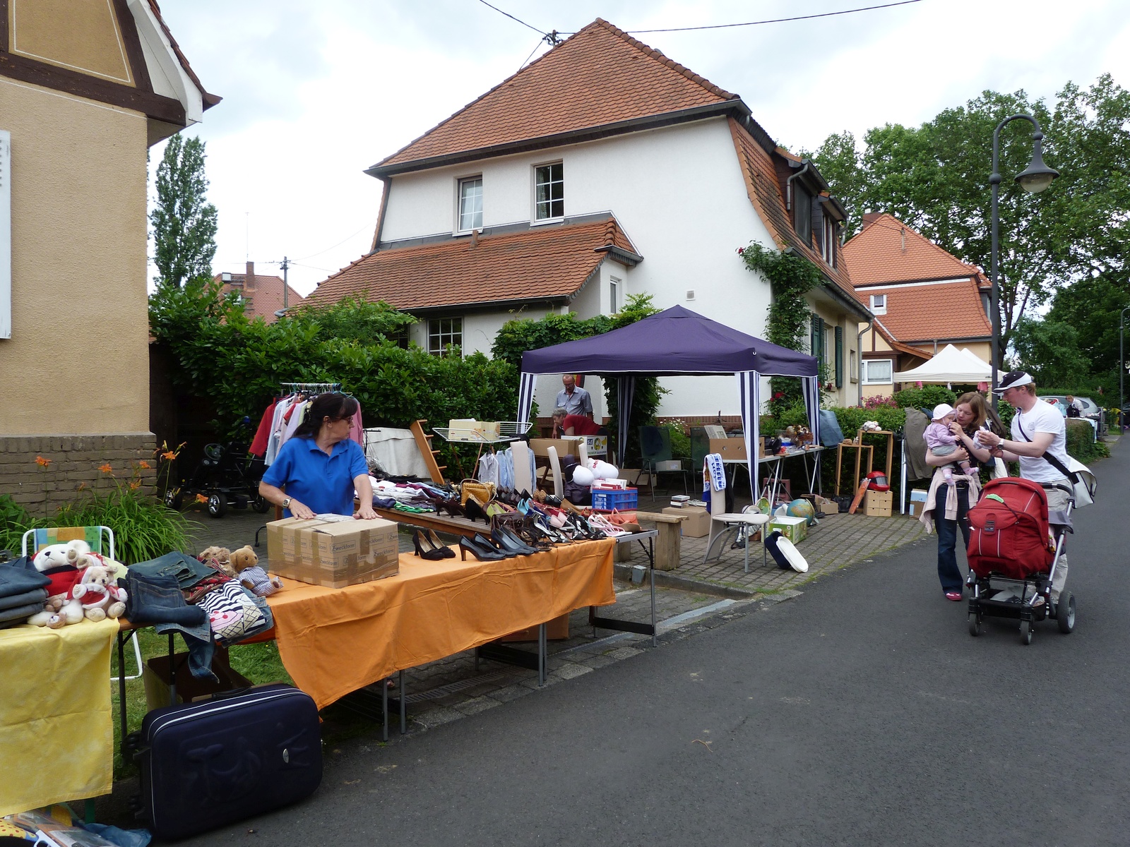 Ein kleines Jubiläum konnten die Initiatoren des Höfeflohmarkts im Heimchen, einem Viertel in Frankfurt am Main Unterliederbach, am Sonntag, dem 21.Juni 2015, feiern: Der Flohmarkt fand an diesem Tag zum fünften Mal statt. Der Spaß der Nachbarn an der Veranstaltung ist ungebrochen, vom Achtzylinder-Oldtimer bis zur im Vergleich ärmlichen Einzylinder-Antriebseinheit für einen Motorroller wurde alles mögliche angeboten: Spiele, Spielsachen, Kleidungsstücke, Geschirr, alte Möbel, Bücher, CDs und DVDs. Und wer beim Anblick eines der Bilder einen Schrecken bekommt, – der Kinderwagen ist ein Modell für Zwillinge und das darin liegende Kind drohte keineswegs zu ersticken.