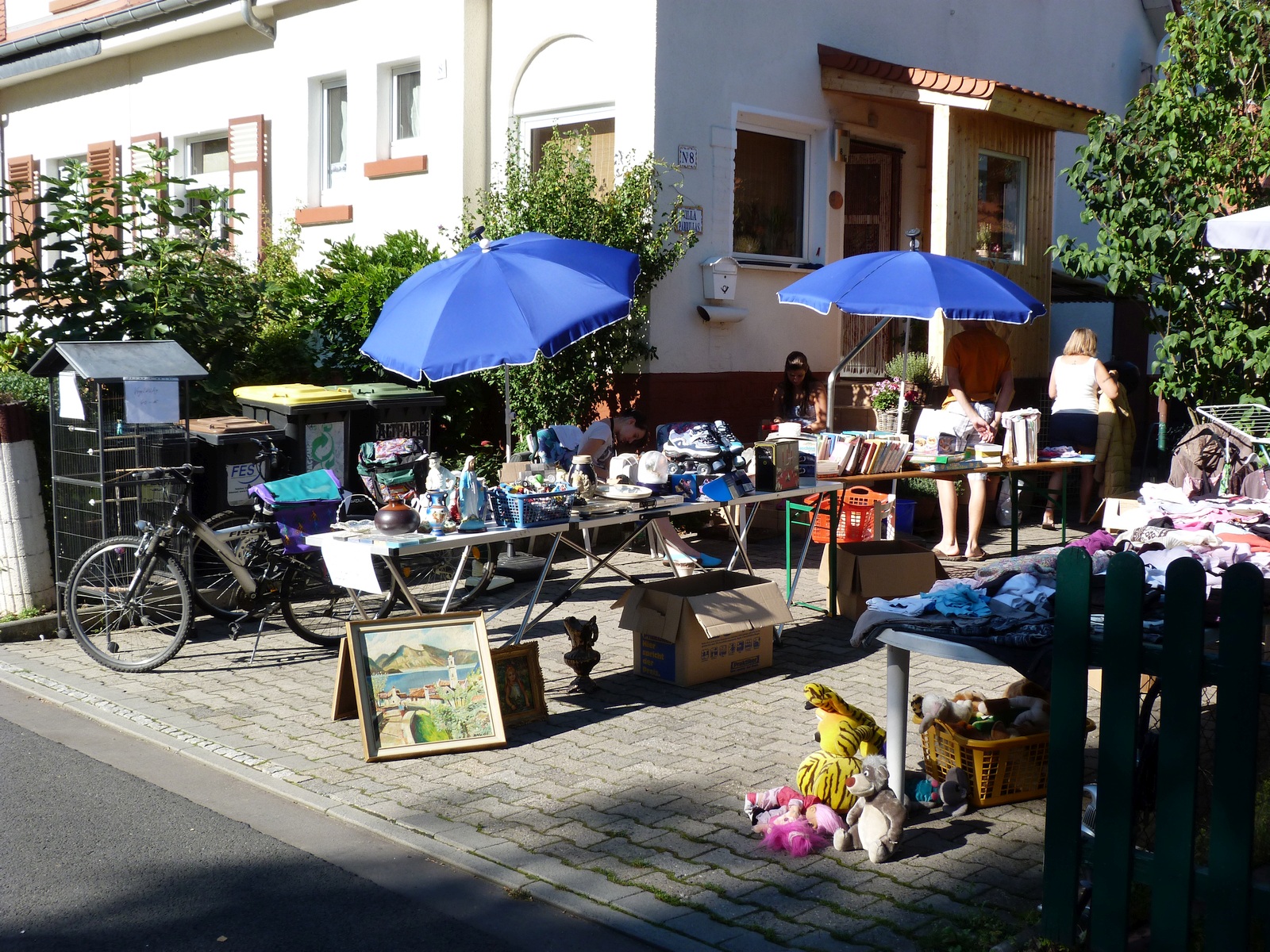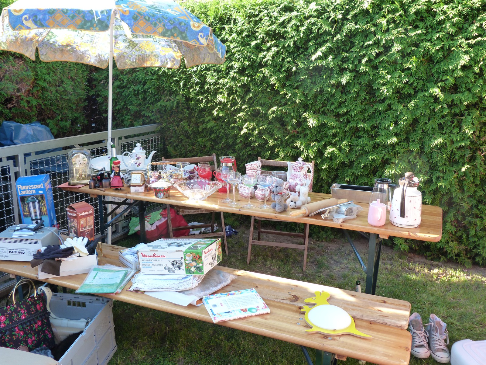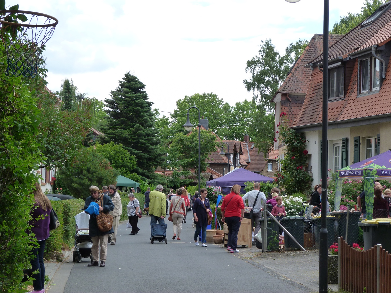 Ein kleines Jubiläum konnten die Initiatoren des Höfeflohmarkts im Heimchen, einem Viertel in Frankfurt am Main Unterliederbach, am Sonntag, dem 21.Juni 2015, feiern: Der Flohmarkt fand an diesem Tag zum fünften Mal statt. Der Spaß der Nachbarn an der Veranstaltung ist ungebrochen, vom Achtzylinder-Oldtimer bis zur im Vergleich ärmlichen Einzylinder-Antriebseinheit für einen Motorroller wurde alles mögliche angeboten: Spiele, Spielsachen, Kleidungsstücke, Geschirr, alte Möbel, Bücher, CDs und DVDs. Und wer beim Anblick eines der Bilder einen Schrecken bekommt, – der Kinderwagen ist ein Modell für Zwillinge und das darin liegende Kind drohte keineswegs zu ersticken.