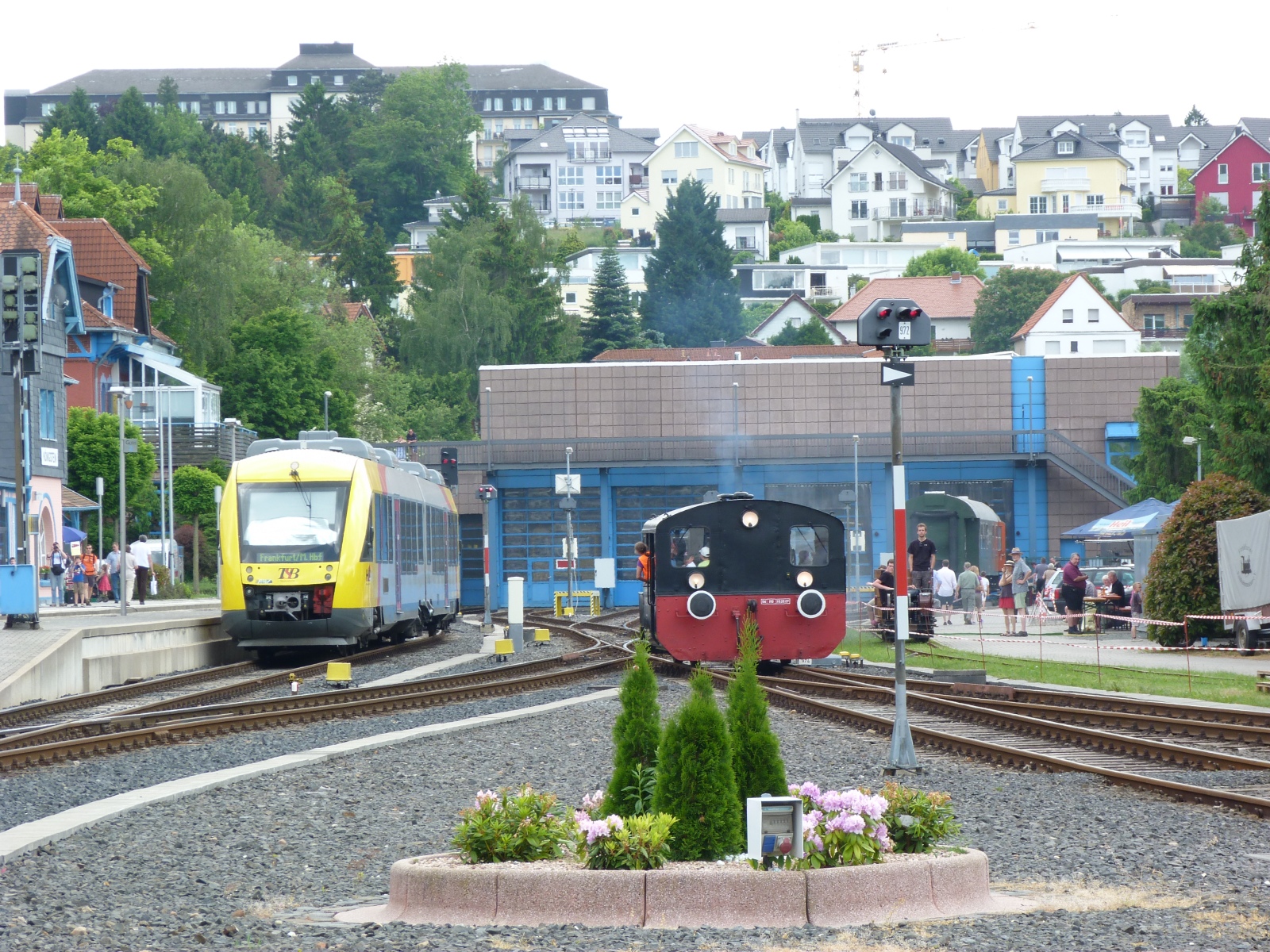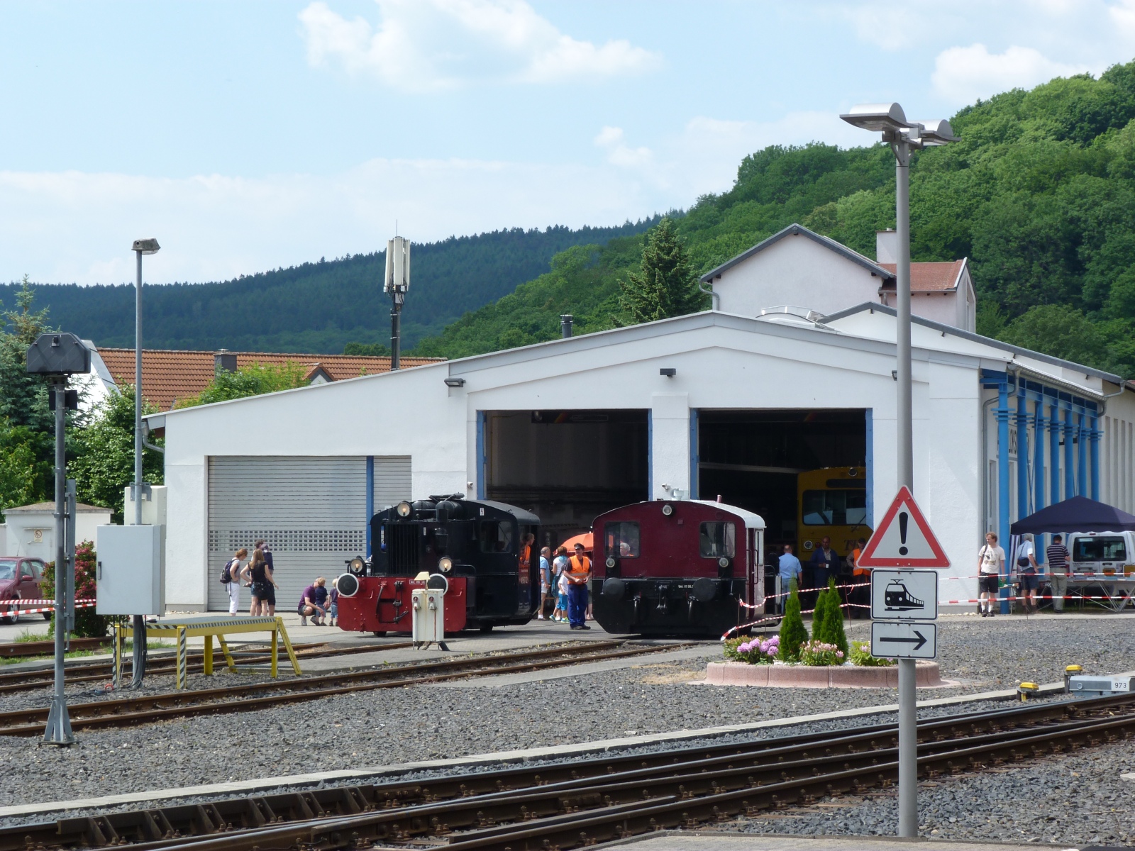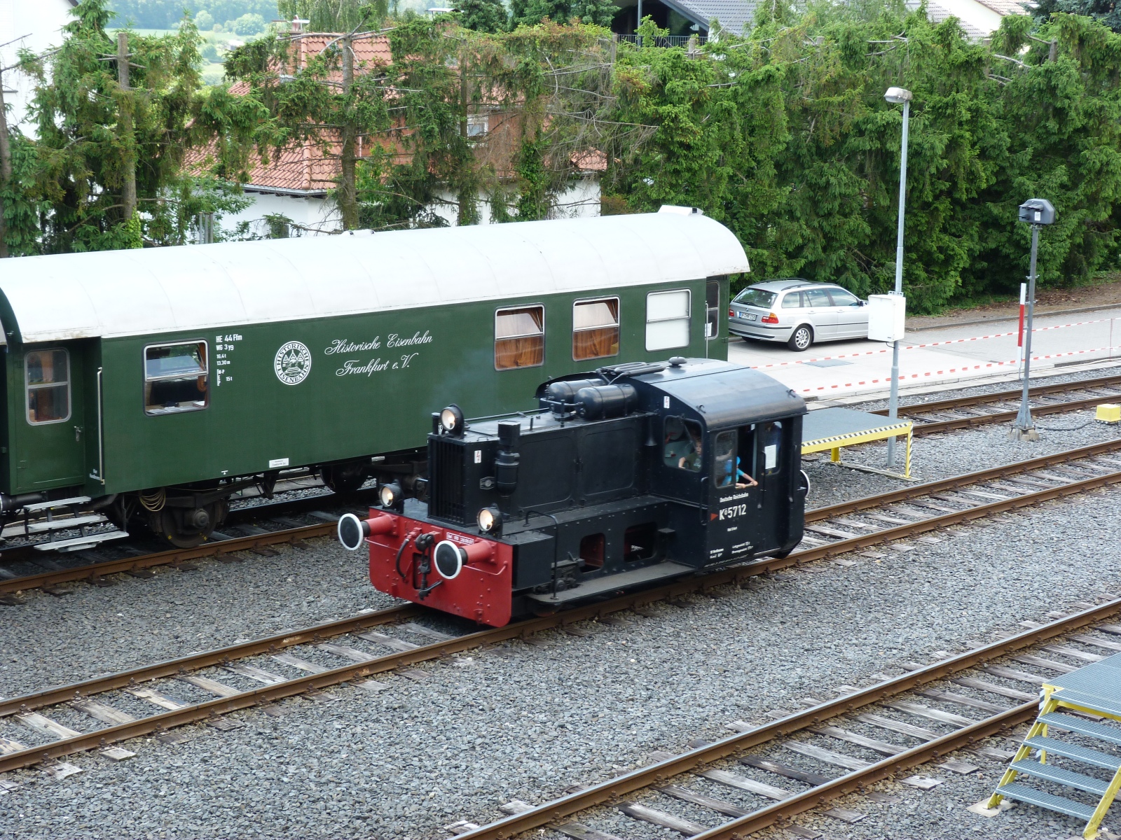 Am Pfingstsonntag war neben Volldampf auch noch Diesel-Power angesagt. Neben dem von 52 4867 gezogenen Woogtal Express verdichtete ein aus zwei Waggons und einer modernen Diesellokomotive bestehender Zug den Takt auf der Strecke zwischen Königstein und Frankfurt-Höchst. Bei der Diesellokomotive handelte es sich um eine Vossloh G 1000 BB der HFM Management für Hafen und Markt Frankfurt (Hafenbahn), für die die Fahrt auf dieser Strecke wohl eine Premiere war.