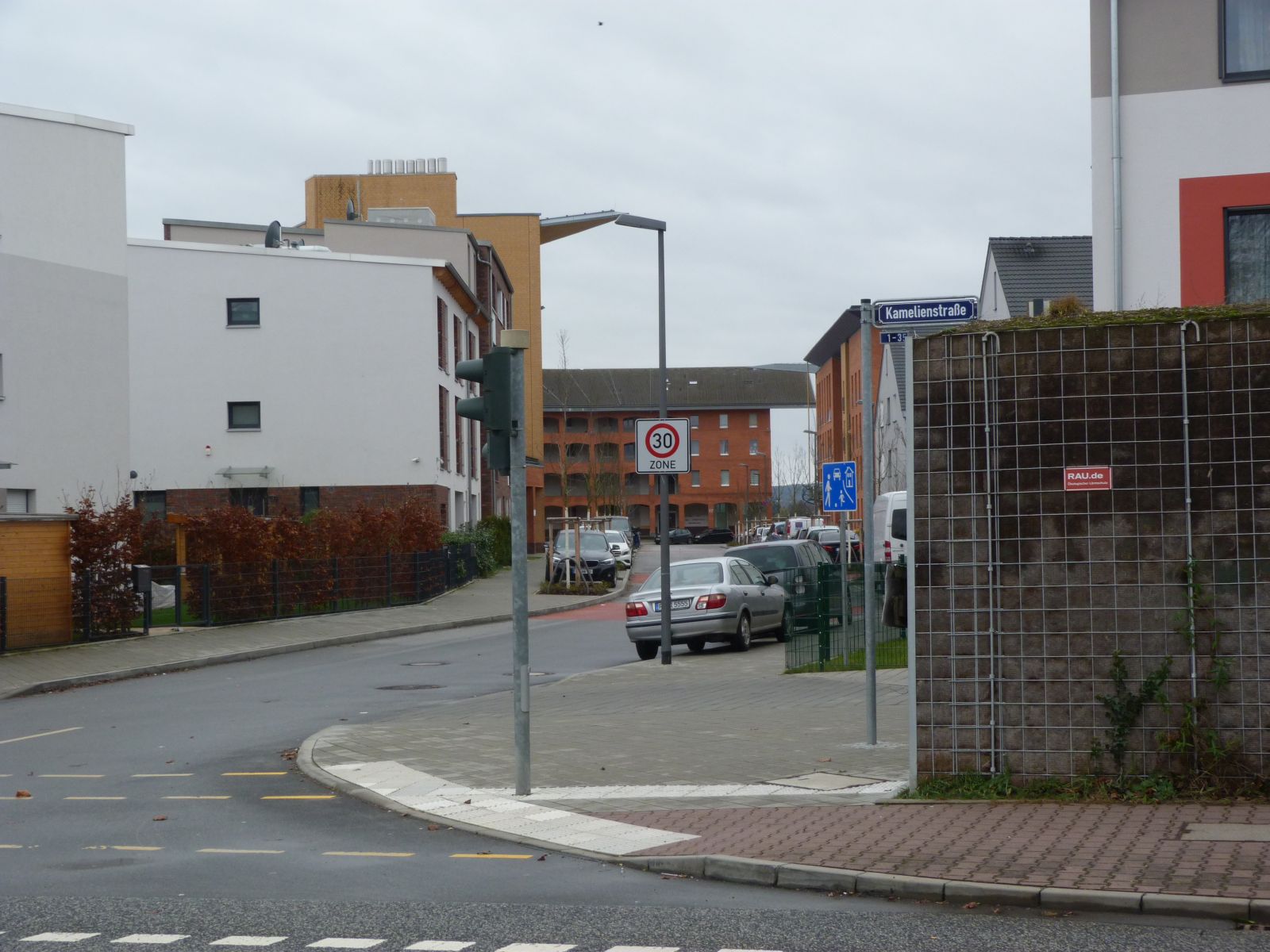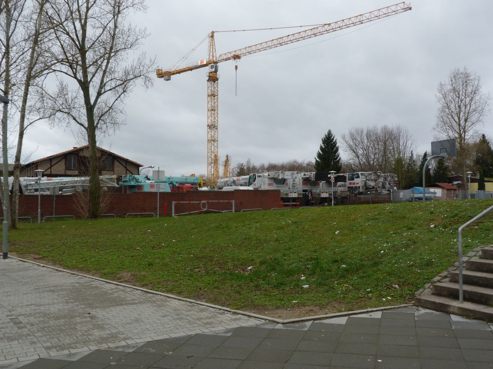 Über den Bahnübergang an der Hunsrückstraße, Graubner Park und Marktplatz ging es zurück Richtung Sieringstraße, wobei ein kleiner Schlenker durch den kleinen Park zwischen Grauer Stein und Euckenstraße führte. In der Nachbarschaft des Parks war zu diesem Zeitpunkt das neue Kinderzentrum Euckenstraße im Bau.