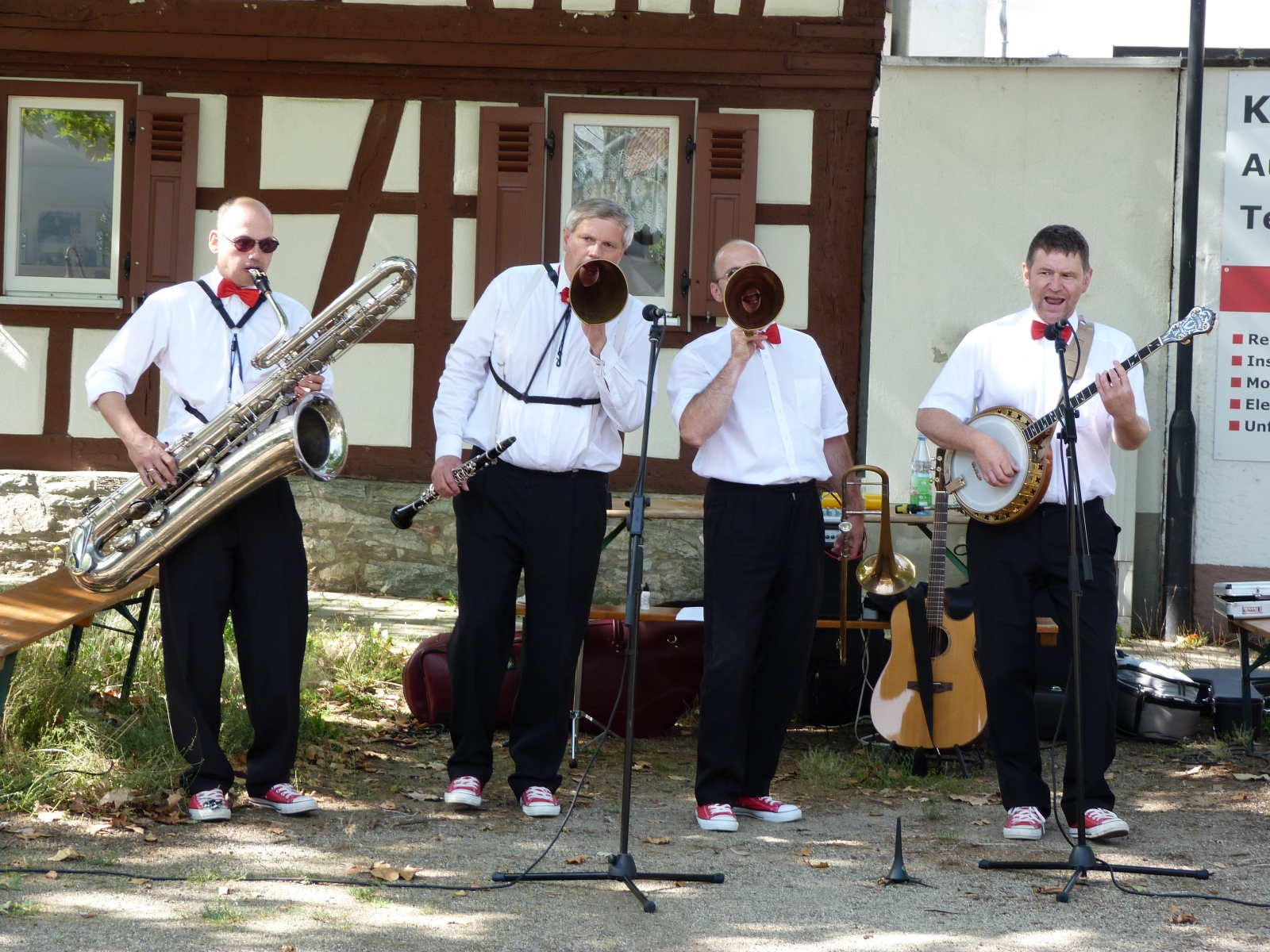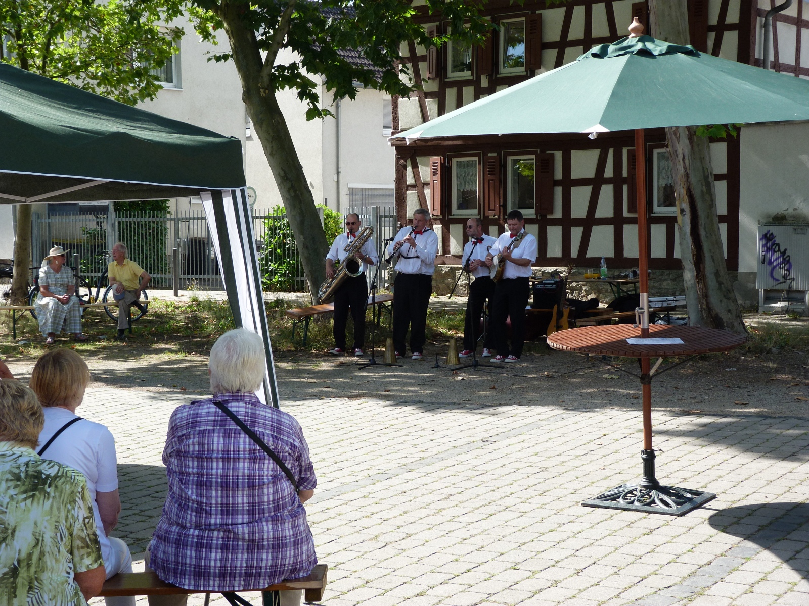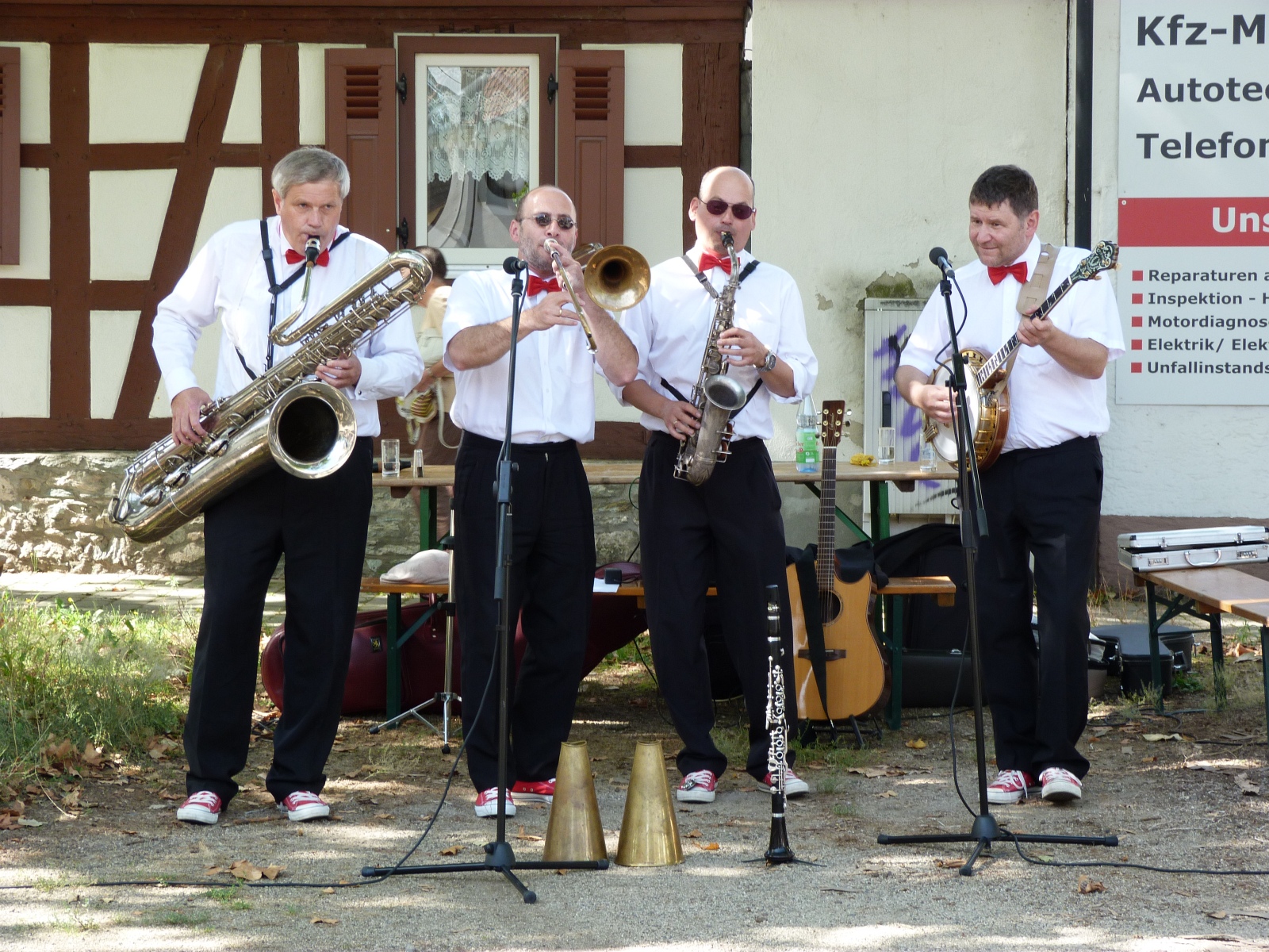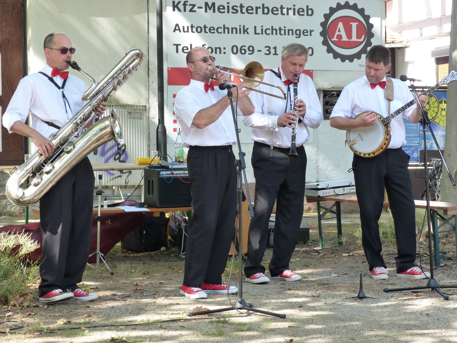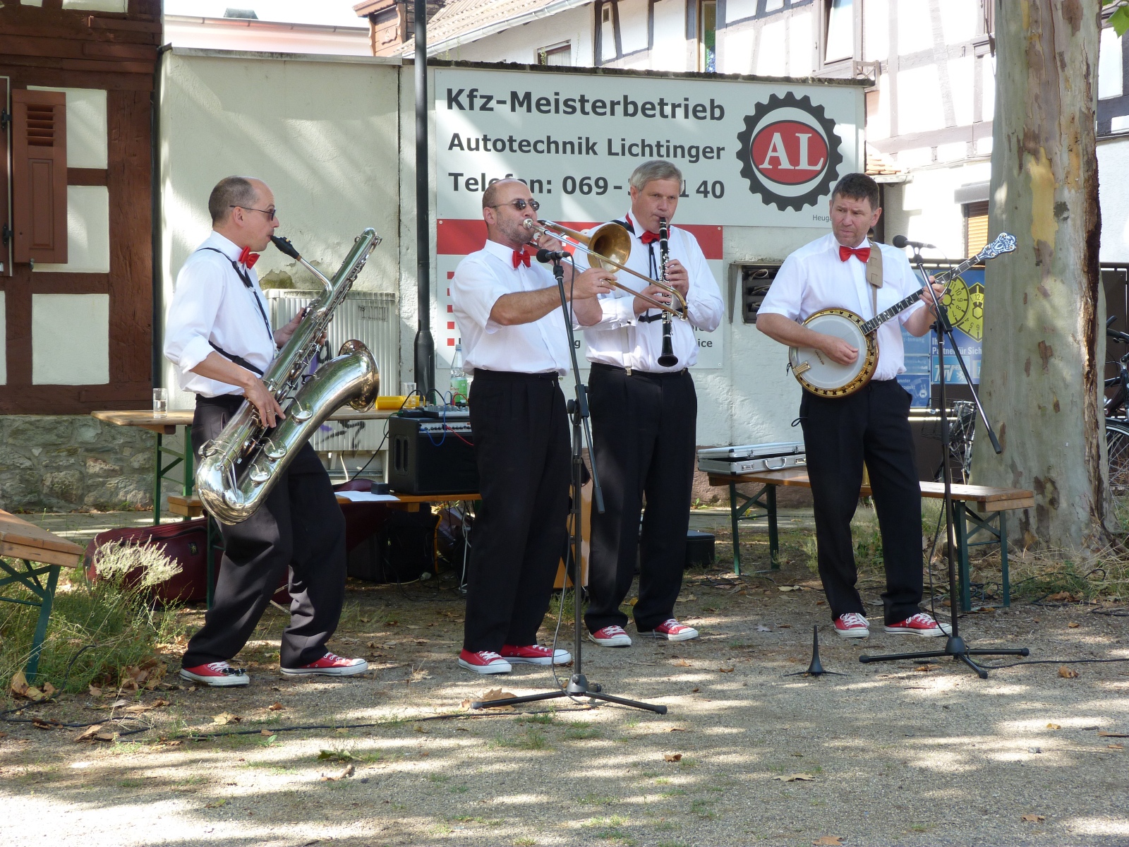 19. August 2012, die Hot Four spielen auf dem Unterliederbacher Marktplatz. Gleichzeitig ist die Unterliederbacher Dorfkirche, um die sich heute alles dreht, für Besichtigungen geöffnet. Die Dorfkirche, deren Ursprünge bis ins späte 12. Jahrhundert oder frühe 13. Jahrhundert zurückreichen und deren heutige Ausgestaltung weitestgehend auf das 18. Jahrhundert zurückgeht, ist das Schmuckstück des Frankfurter Stadtteils.