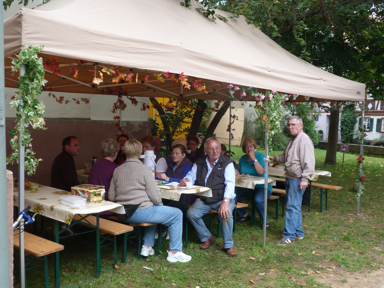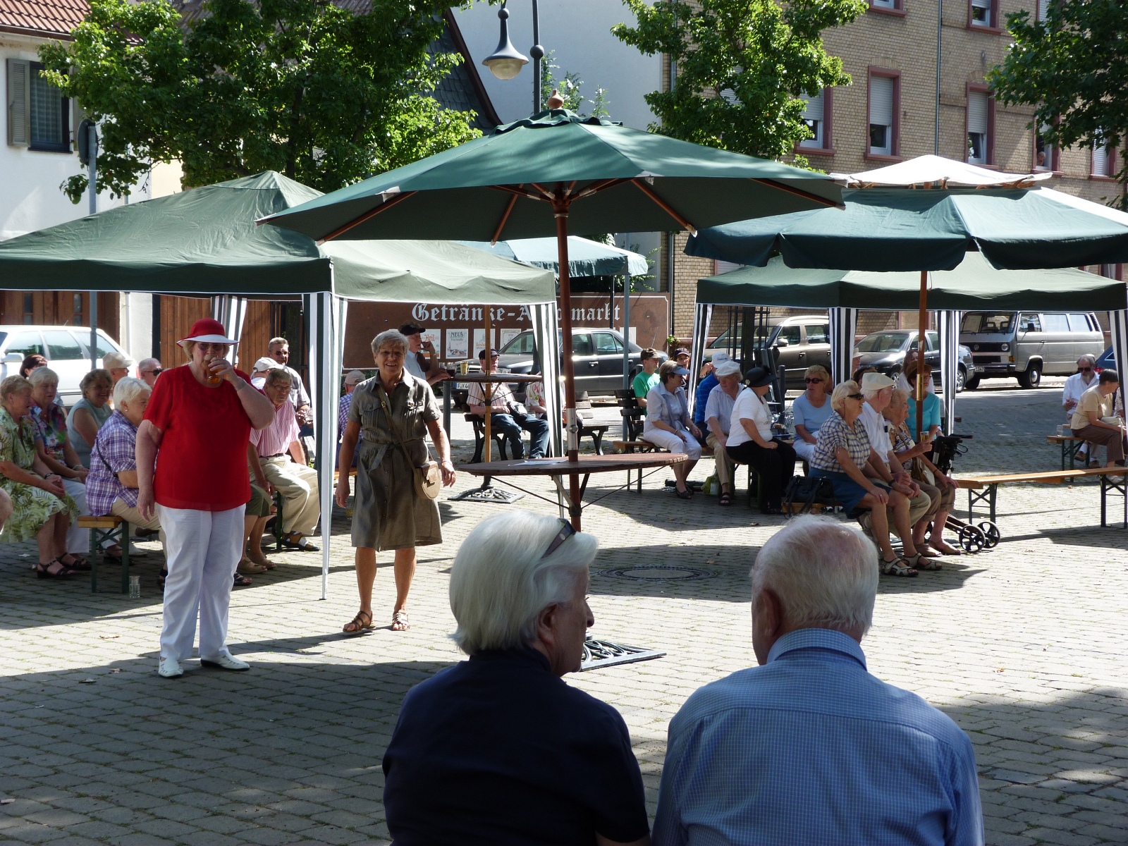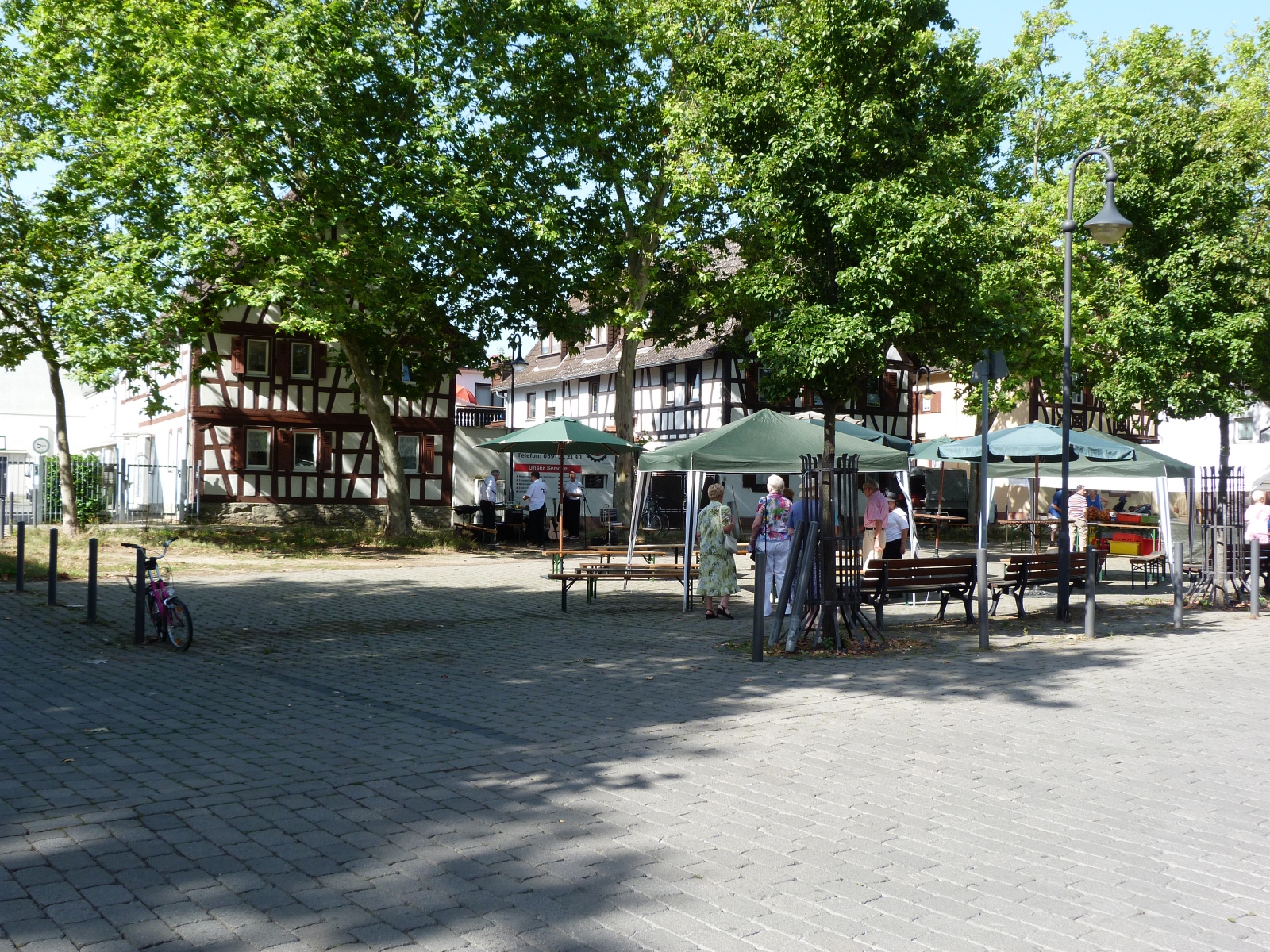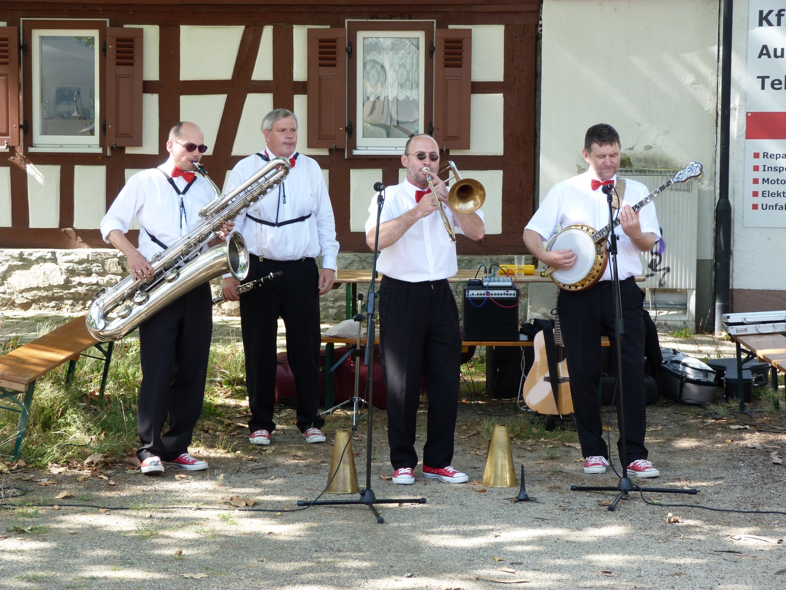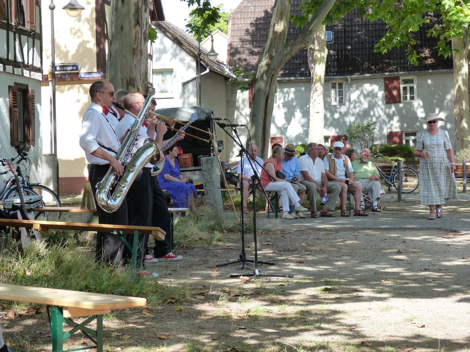19. August 2012, die Hot Four spielen auf dem Unterliederbacher Marktplatz. Gleichzeitig ist die Unterliederbacher Dorfkirche, um die sich heute alles dreht, für Besichtigungen geöffnet. Die Dorfkirche, deren Ursprünge bis ins späte 12. Jahrhundert oder frühe 13. Jahrhundert zurückreichen und deren heutige Ausgestaltung weitestgehend auf das 18. Jahrhundert zurückgeht, ist das Schmuckstück des Frankfurter Stadtteils.