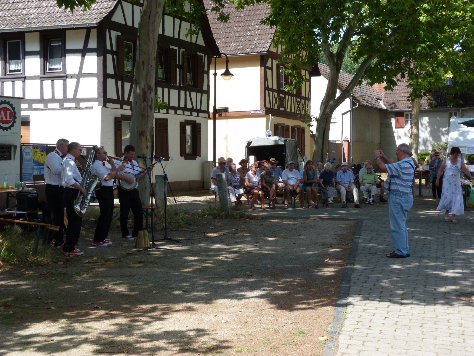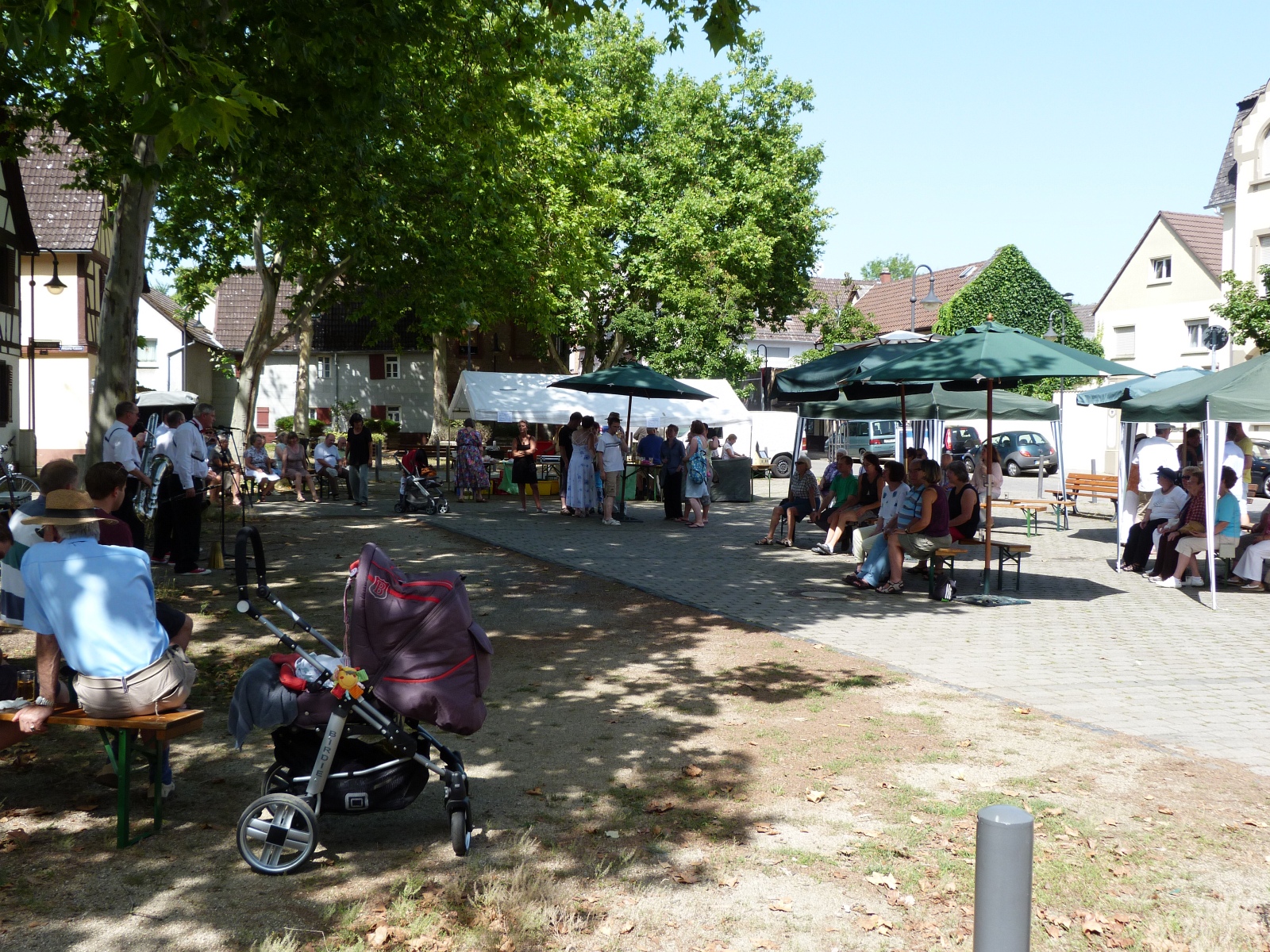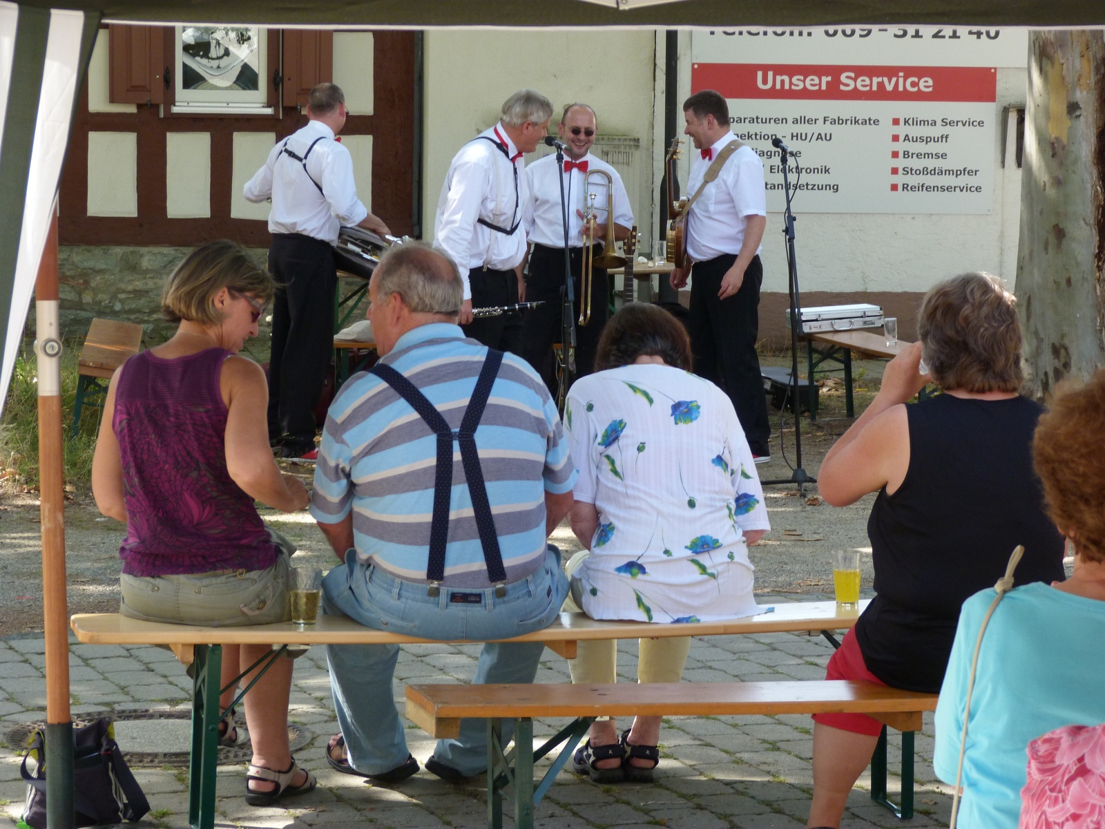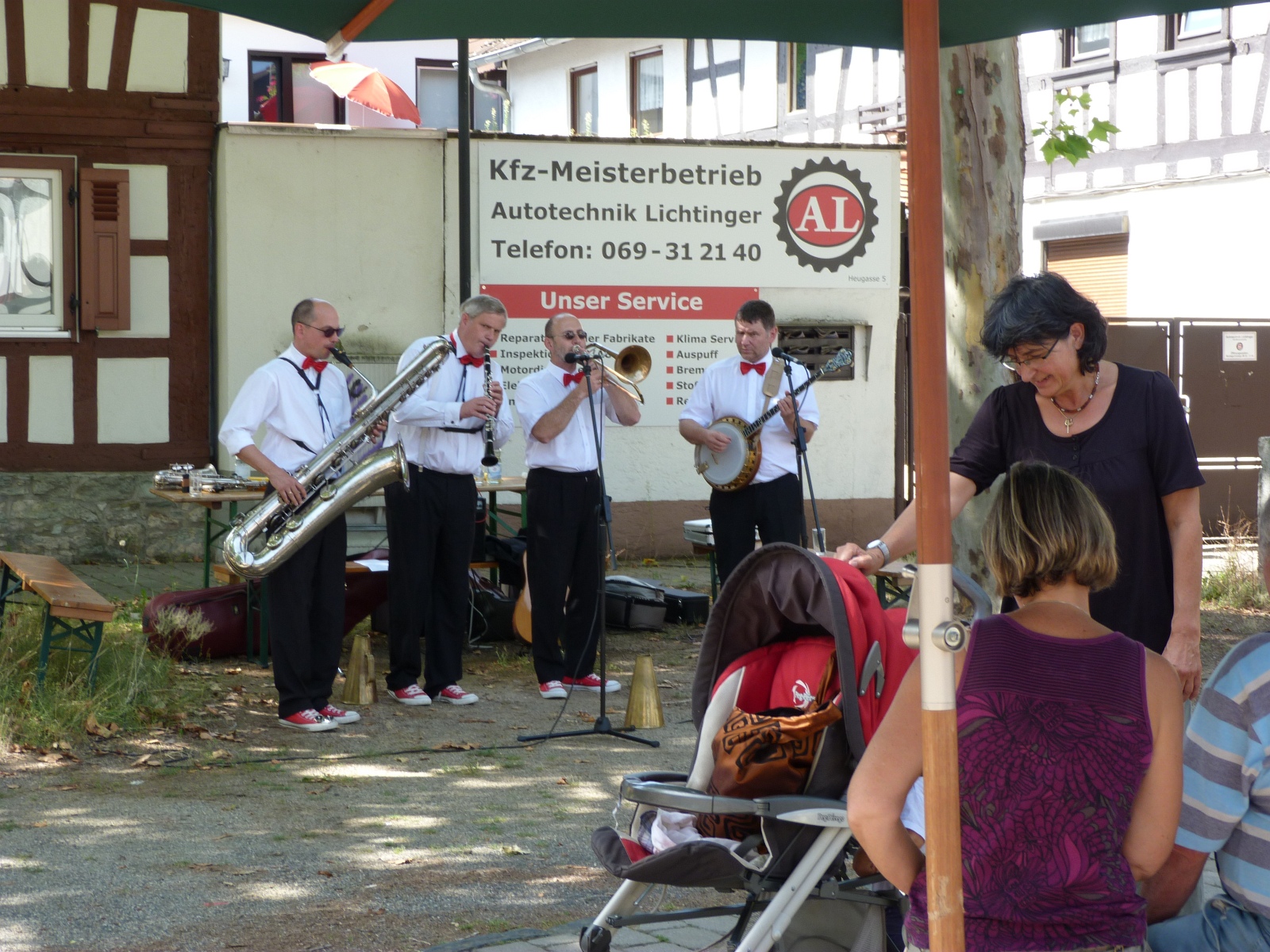 19. August 2012, die Hot Four spielen auf dem Unterliederbacher Marktplatz. Gleichzeitig ist die Unterliederbacher Dorfkirche, um die sich heute alles dreht, für Besichtigungen geöffnet. Die Dorfkirche, deren Ursprünge bis ins späte 12. Jahrhundert oder frühe 13. Jahrhundert zurückreichen und deren heutige Ausgestaltung weitestgehend auf das 18. Jahrhundert zurückgeht, ist das Schmuckstück des Frankfurter Stadtteils.