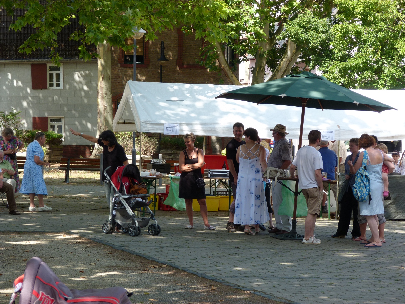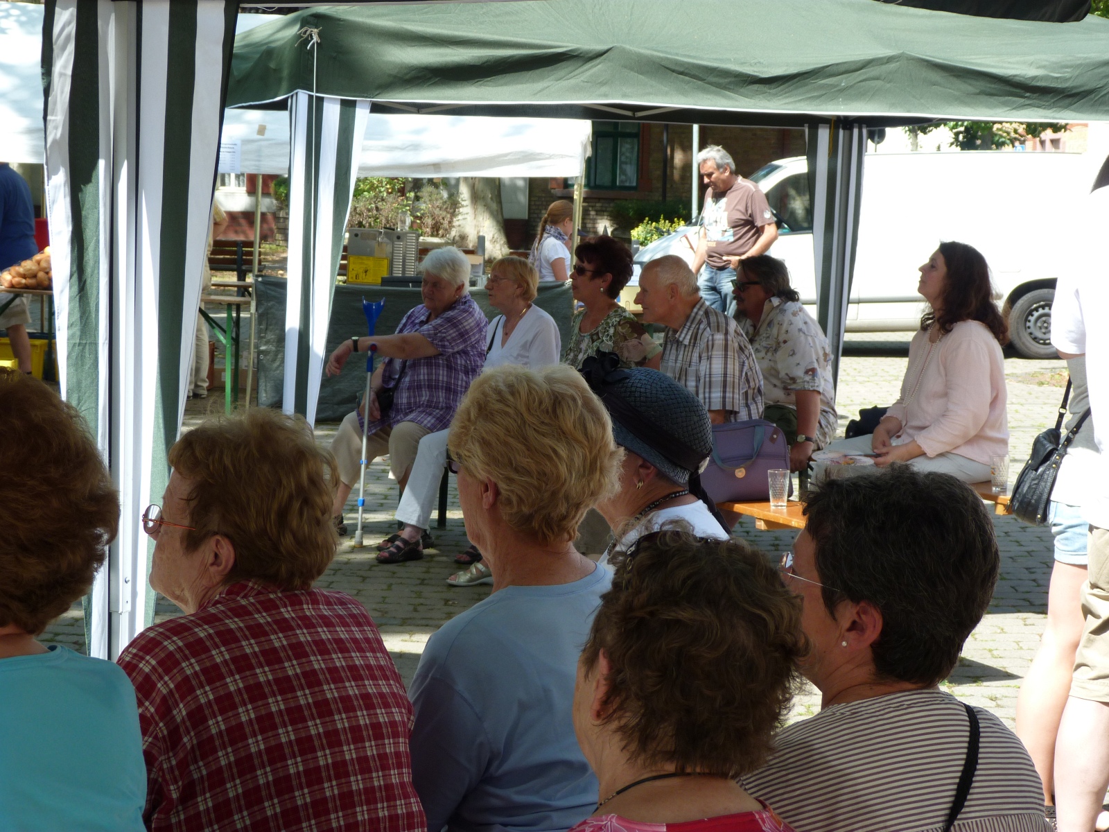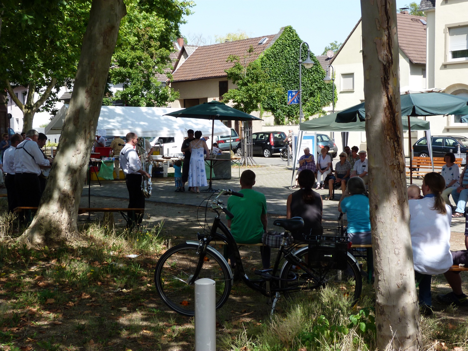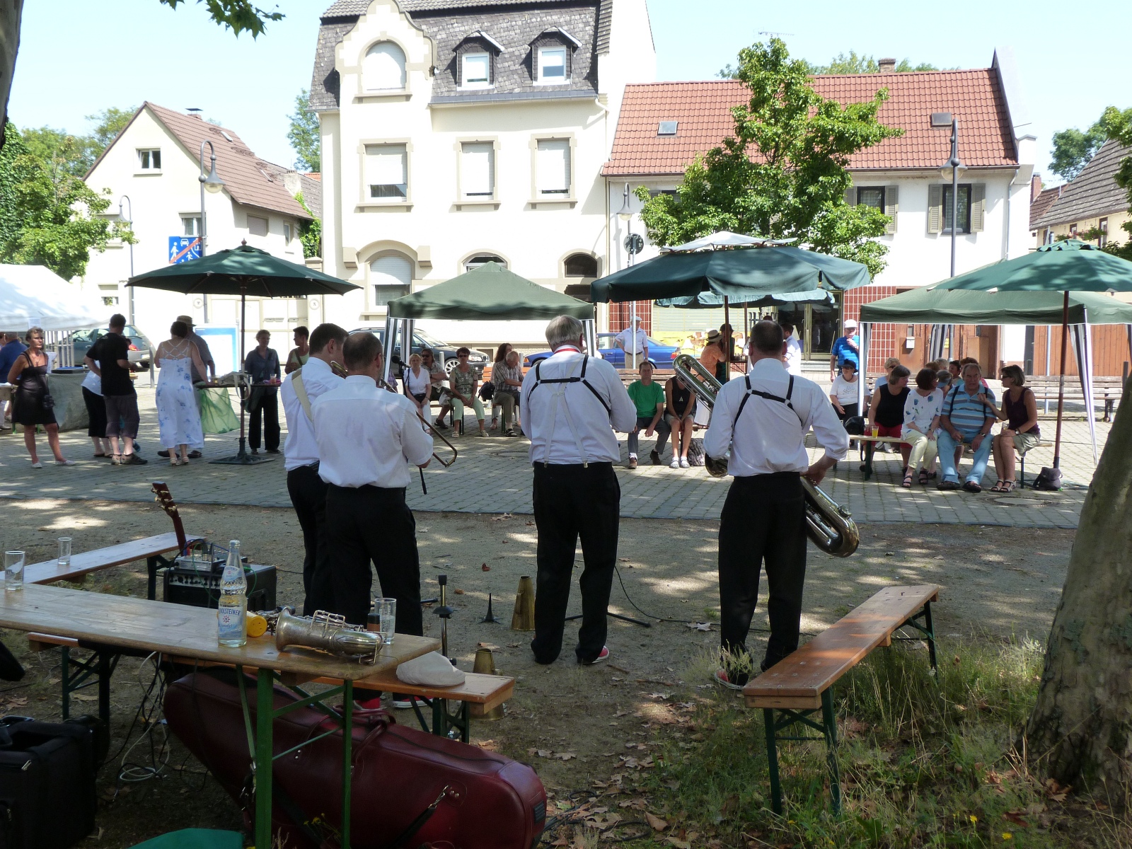 19. August 2012, die Hot Four spielen auf dem Unterliederbacher Marktplatz. Gleichzeitig ist die Unterliederbacher Dorfkirche, um die sich heute alles dreht, für Besichtigungen geöffnet. Die Dorfkirche, deren Ursprünge bis ins späte 12. Jahrhundert oder frühe 13. Jahrhundert zurückreichen und deren heutige Ausgestaltung weitestgehend auf das 18. Jahrhundert zurückgeht, ist das Schmuckstück des Frankfurter Stadtteils.